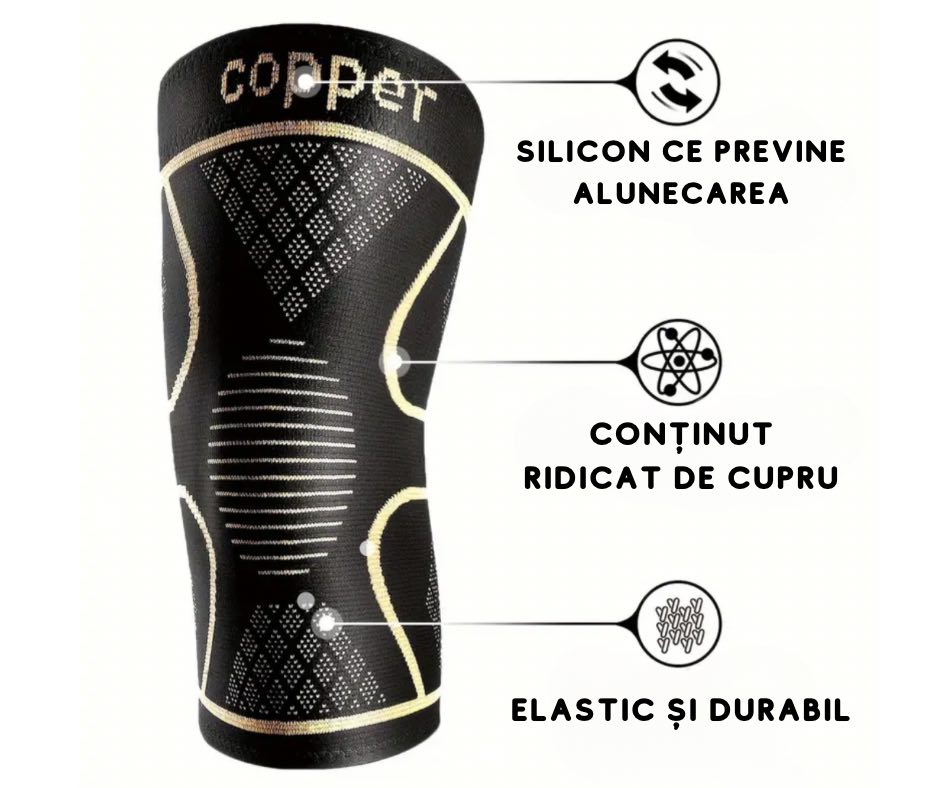 Genunchiera cu fir de cupru ofera suport si stabilitate pentru genunchi, iar prin compresie amelioreaza durerea cauza de artrita, rupturi de menisc, inflamati sau leziuni sportive, oferind suport pentru recuperare.